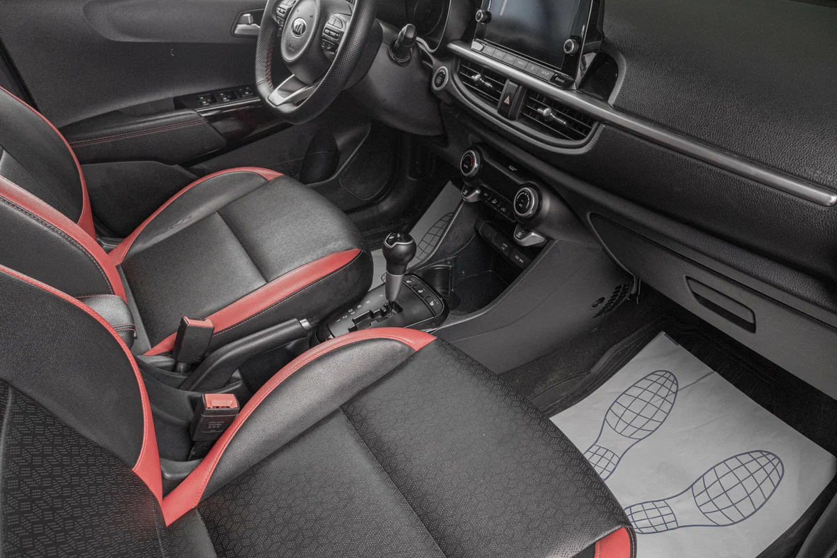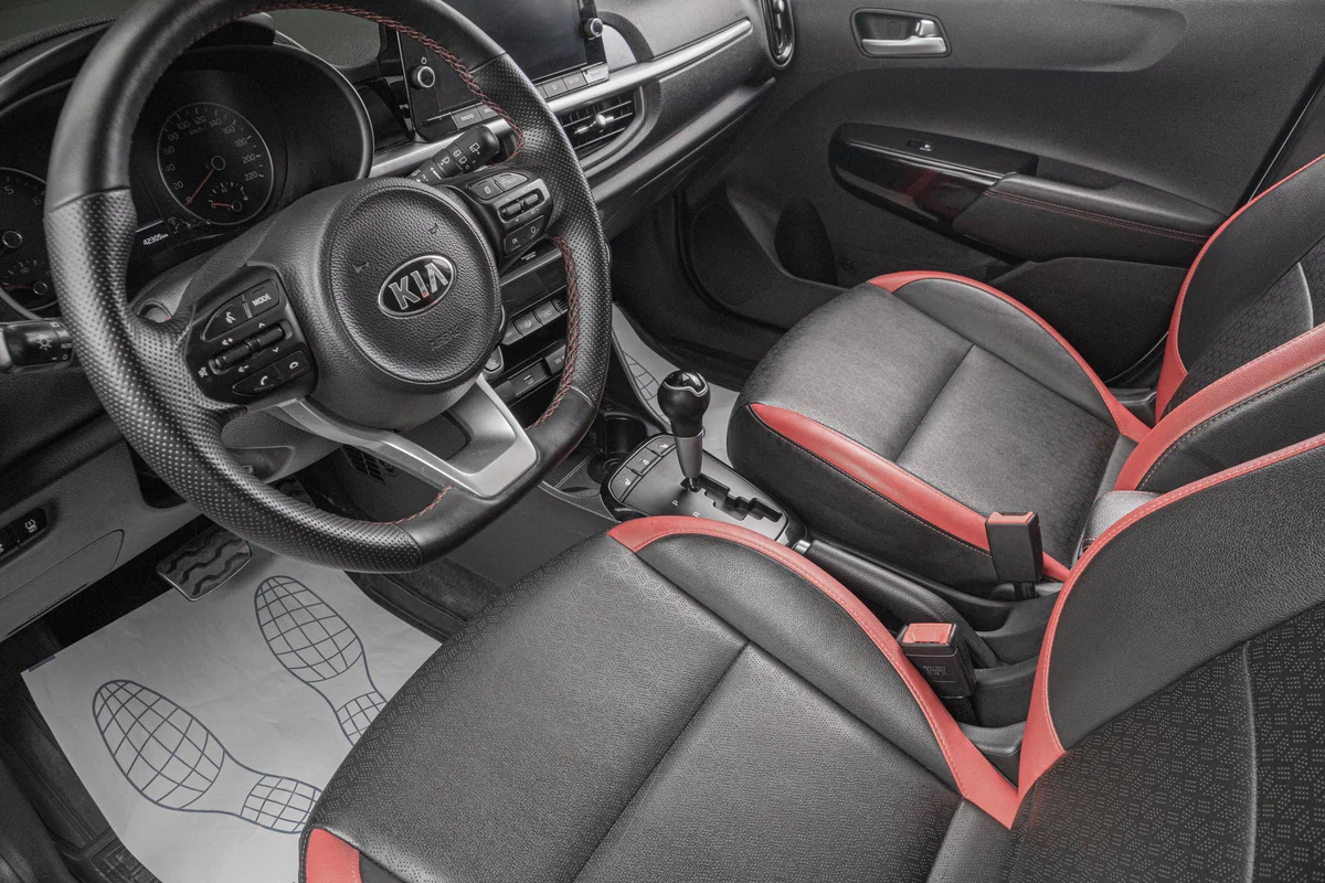 • Интерьер с отделкой искусственной кожей, с красными вставками